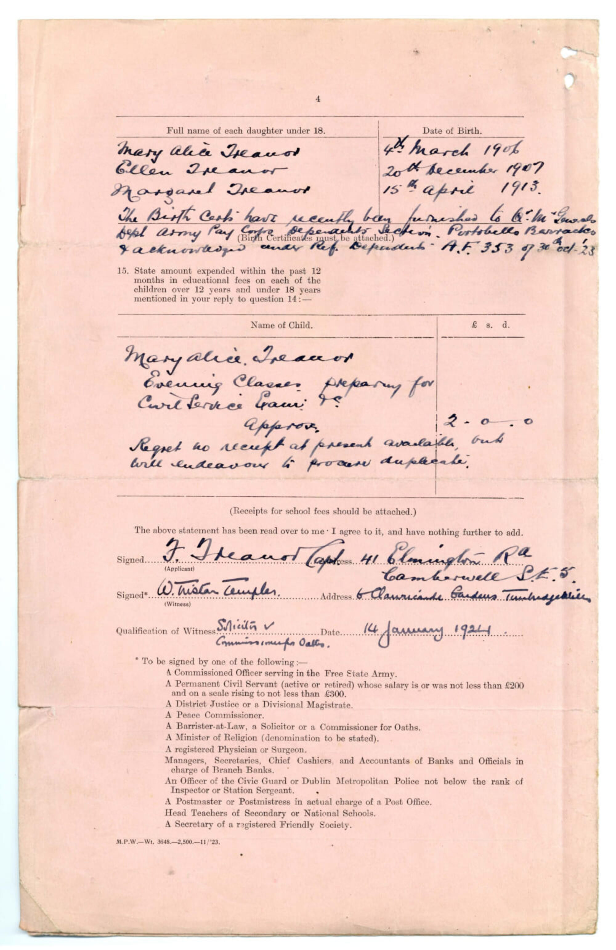 Treanor’s death left his three children (Mary Alice b. 1906; Ellen b.1907 and Margaret b. 1913) orphaned. A search for Treanor’s wife indicates that she (Margaret) died on 4 January 1921 in Monaghan County Infirmary. There is some controversy within the file concerning guardianship of the children, with their maternal aunt stating that London (home of their paternal uncle Francis) was no place for the girls. Although the reasoning is unclear the three girls eventually move to London. Francis was awarded an allowance for both Ellen and Margaret – Mary Alice being over the legal age for consideration. We know nothing of the girls’ life in London, apart from the fact that the dependants’ allowance was paid until 1931 in respect of Margaret.